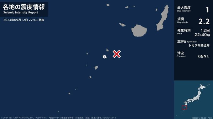 震度1 トカラ列島近海 22:40ごろ