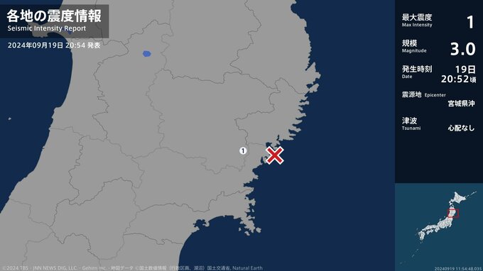 震度1 宮城県沖 20:52ごろ