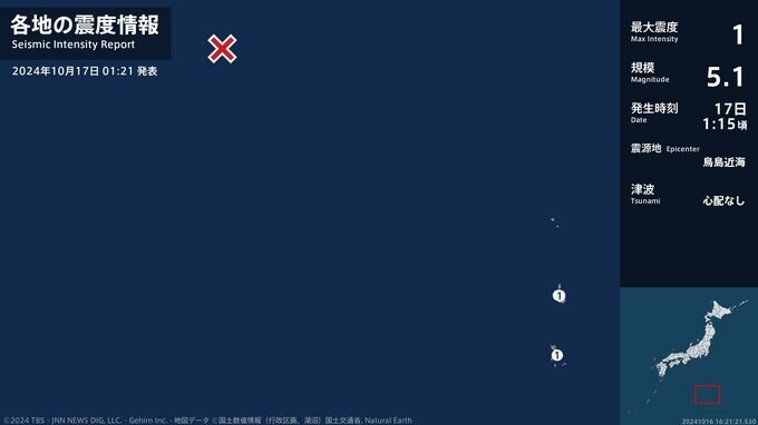 震度1 鳥島近海 01:16ごろ