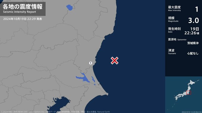 震度1 茨城県沖 22:26ごろ