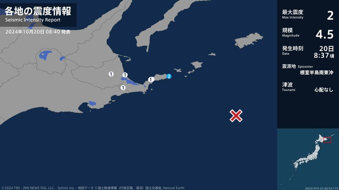 震度2 根室半島南東沖 08:37ごろ