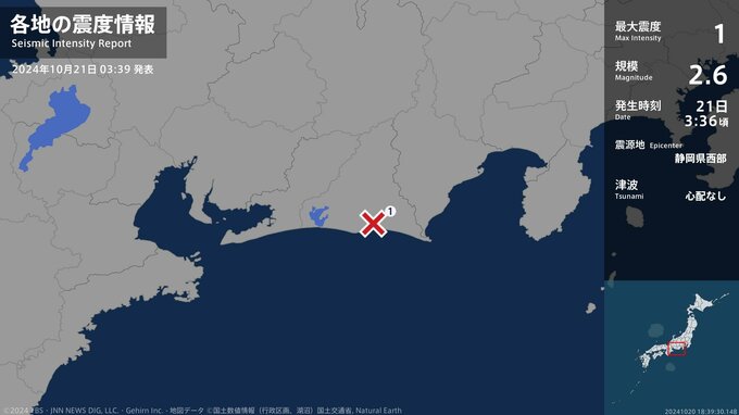 震度1 静岡県西部 03:36ごろ
