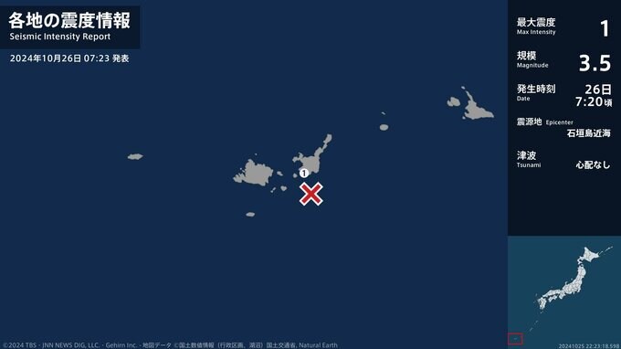 震度1 石垣島近海 07:20ごろ