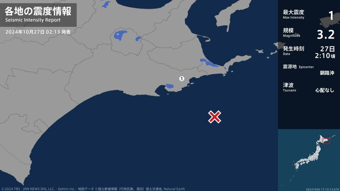 震度1 釧路沖 02:10ごろ