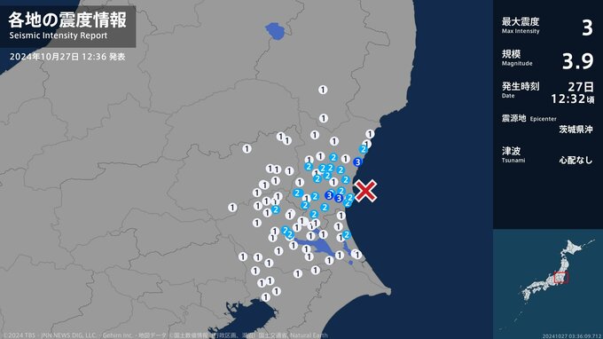震度3 茨城県沖 12:32ごろ