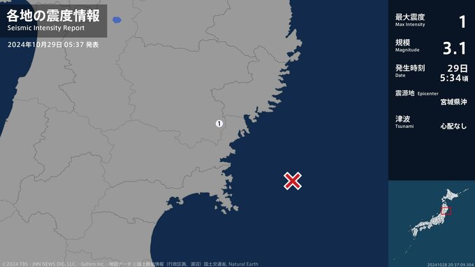 震度1 宮城県沖 05:34ごろ