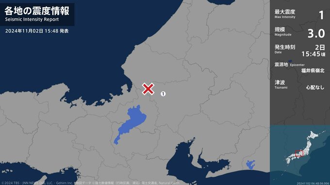 震度1 福井県嶺北 15:45ごろ