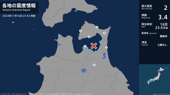 震度2 陸奥湾 23:53ごろ