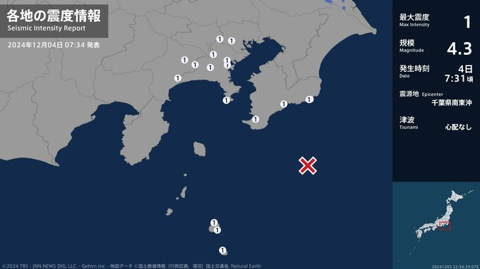 震度1 千葉県南東沖 07:31ごろ
