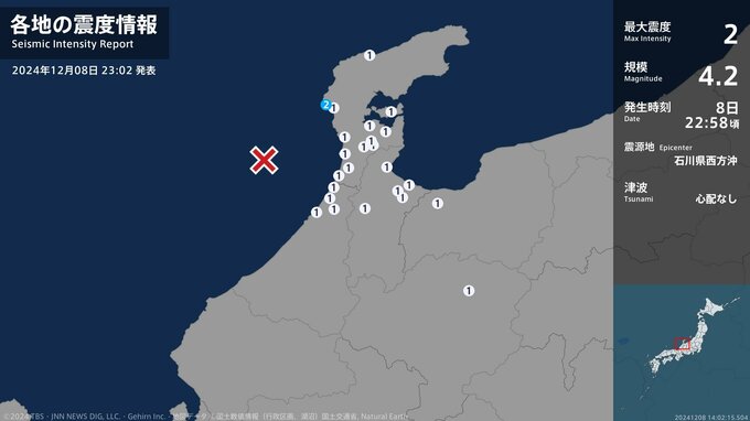 震度2 石川県西方沖 22:58ごろ