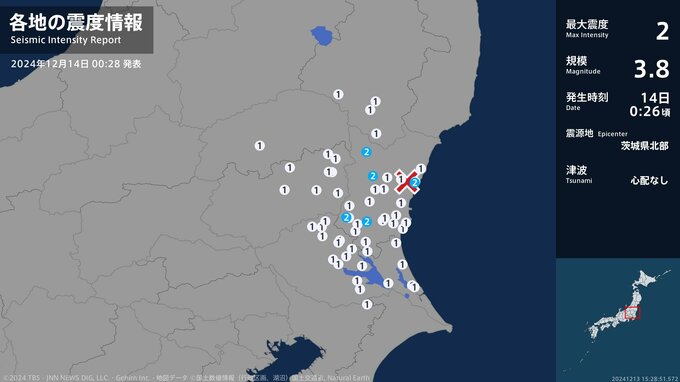 震度2 茨城県北部 00:26ごろ