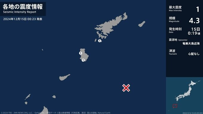 震度1 奄美大島近海 00:19ごろ