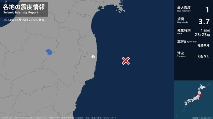 震度1 福島県沖 23:23ごろ