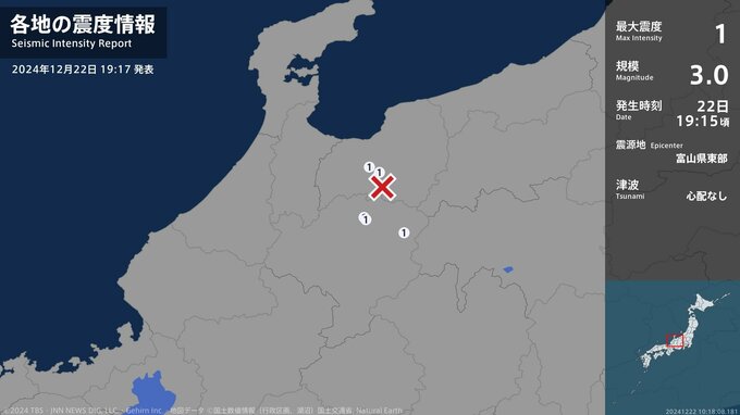 震度1 富山県東部 19:15ごろ