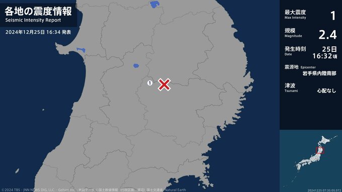 震度1 岩手県内陸南部 16:32ごろ