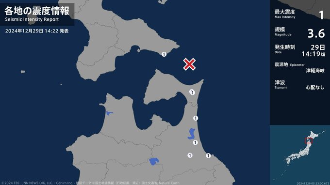 震度1 津軽海峡 14:20ごろ