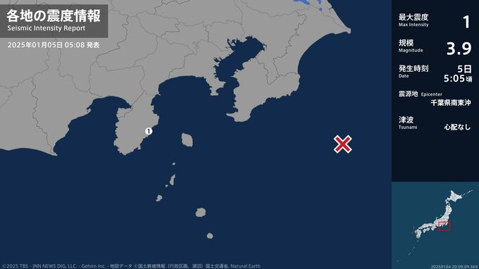 震度1 千葉県南東沖 05:05ごろ