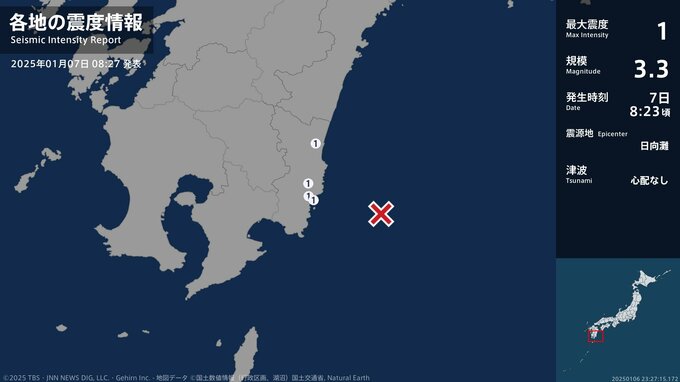 震度1 日向灘 08:24ごろ