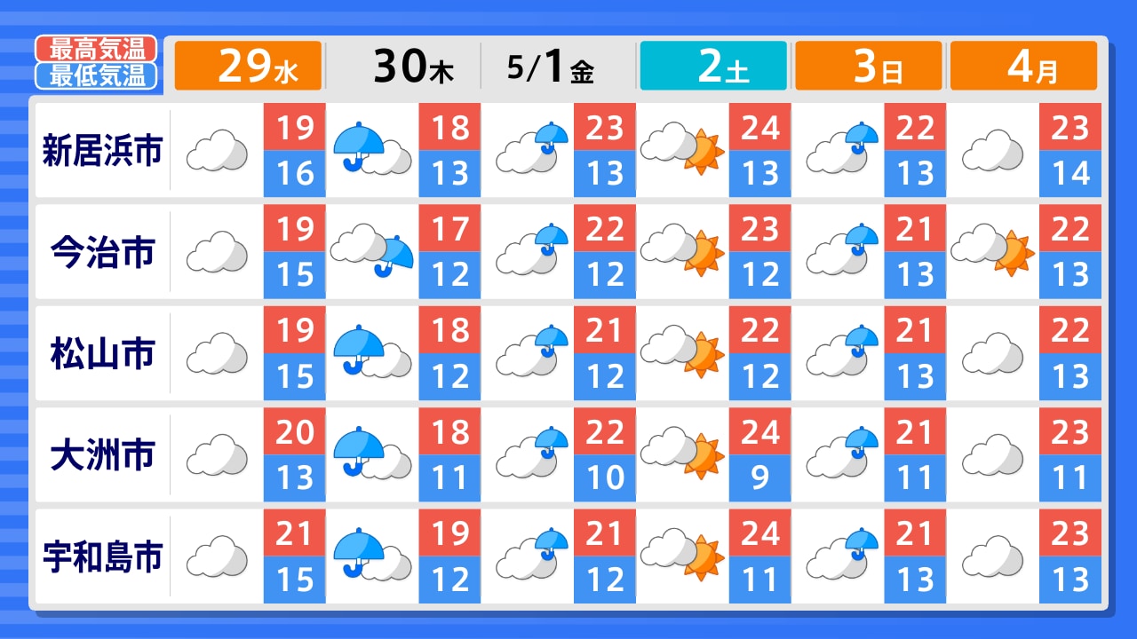 伊方町 大洲市 宇和島市 松山市 久万高原町 今治市 新居浜市 四国中央市
