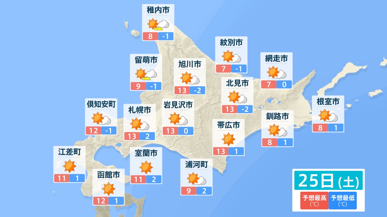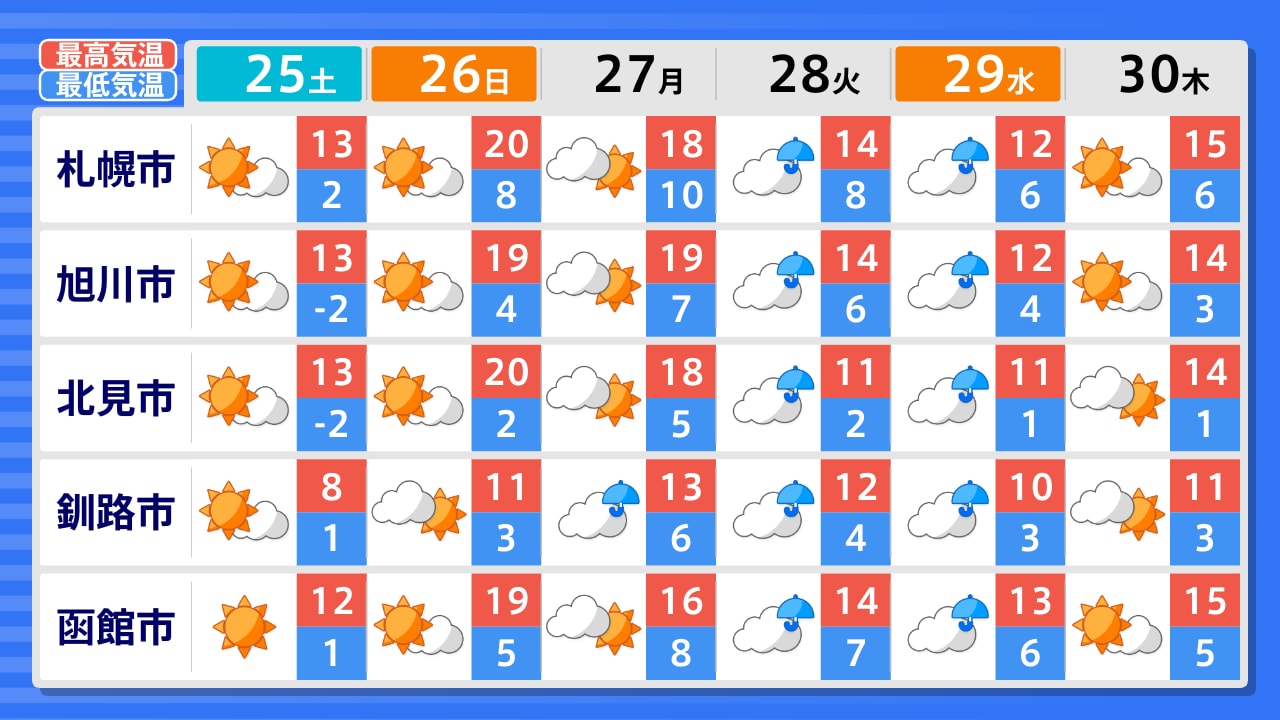 稚内市 留萌市 旭川市 紋別市 網走市 北見市 釧路市 帯広市 根室市 岩見沢市 札幌市 倶知安町 浦河町 室蘭市 函館市 江差町