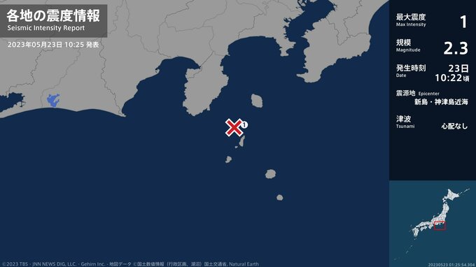 震度1 新島・神津島近海 10:22ごろ
