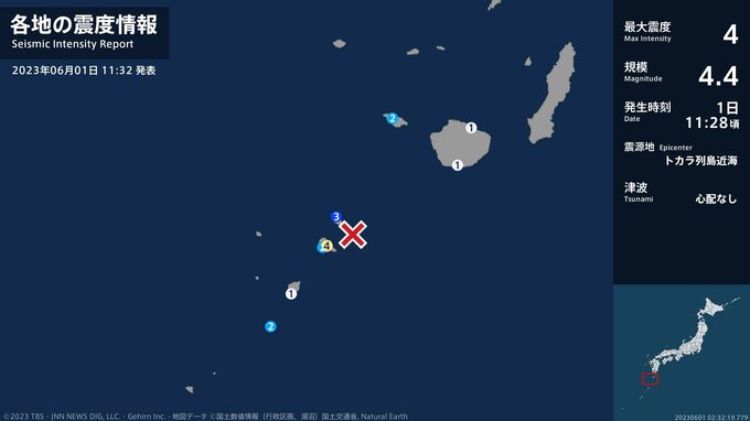 震度4 トカラ列島近海 11:28ごろ