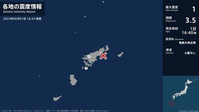 震度1 奄美大島近海 16:40ごろ