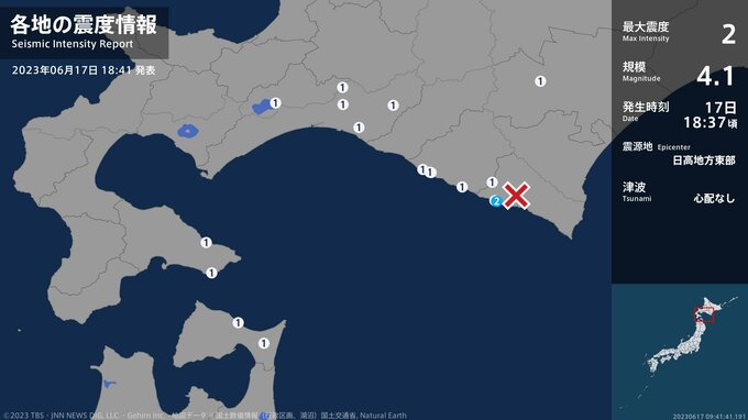 震度2 日高地方東部 18:37ごろ