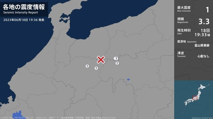震度1 富山県東部 19:33ごろ