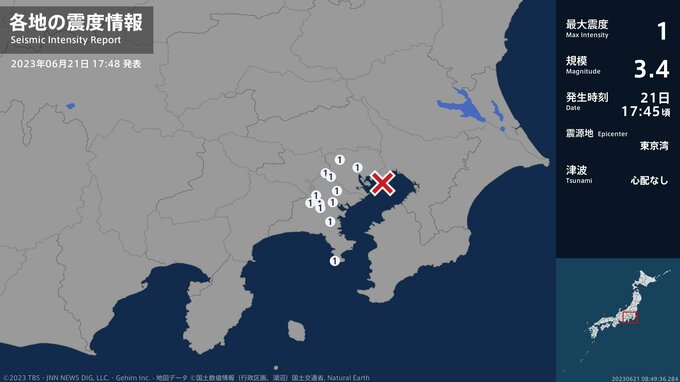 震度1 東京湾 17:46ごろ