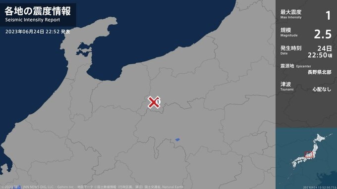 震度1 長野県北部 22:50ごろ