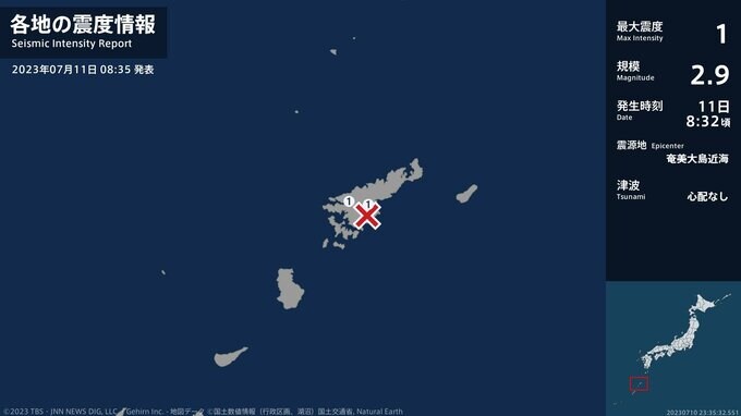 震度1 奄美大島近海 08:32ごろ