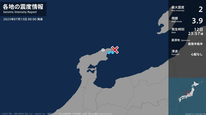 震度2 能登半島沖 23:57ごろ