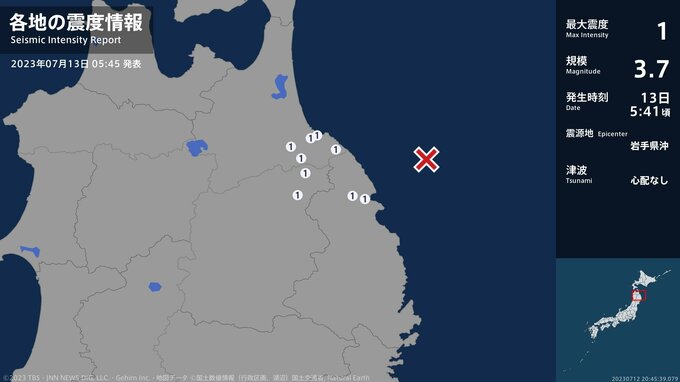 震度1 岩手県沖 05:41ごろ
