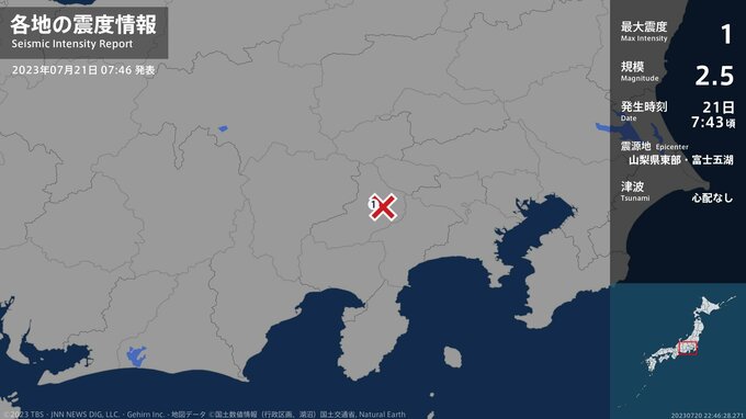 震度1 山梨県東部・富士五湖 07:43ごろ