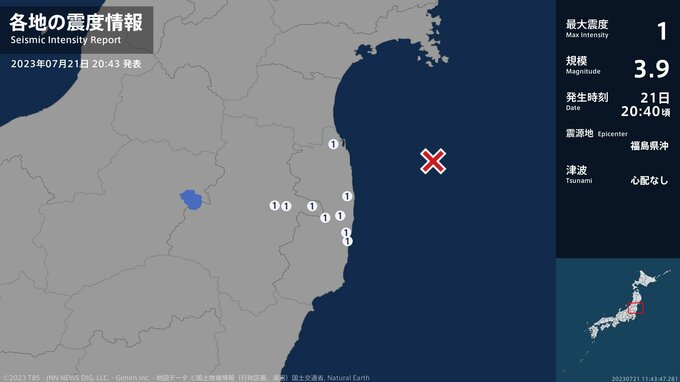 震度1 福島県沖 20:40ごろ