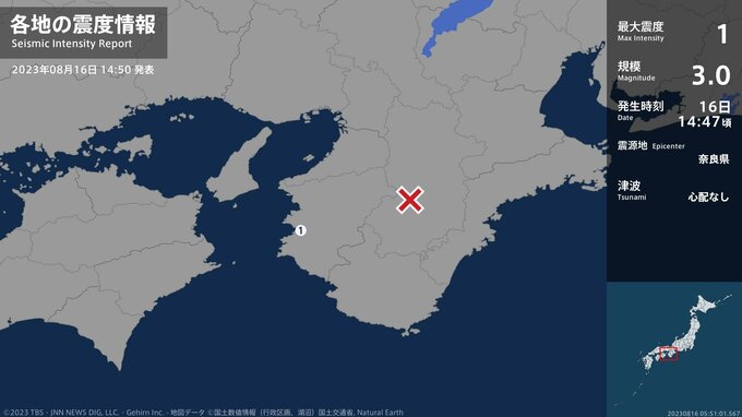 震度1 奈良県 14:47ごろ