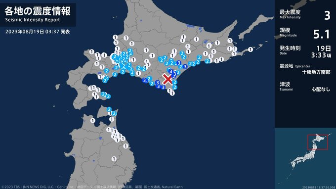 震度3 十勝地方南部 03:33ごろ