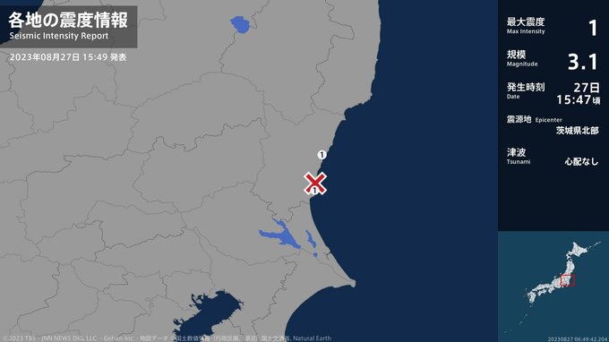 震度1 茨城県北部 15:47ごろ