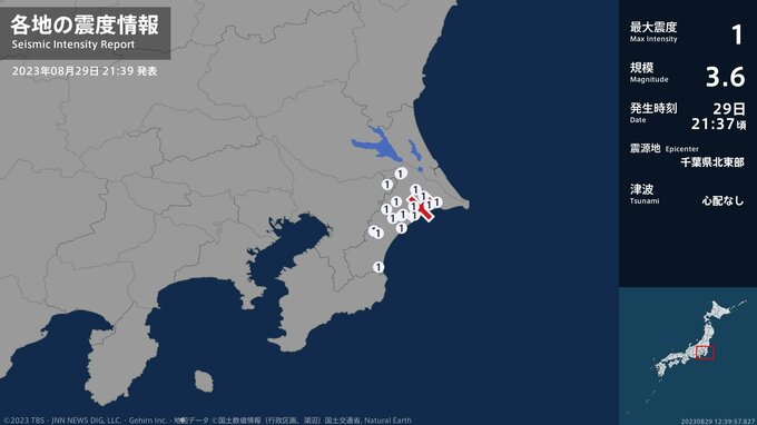 震度1 千葉県北東部 21:37ごろ