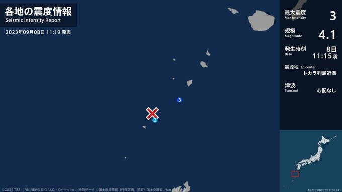 震度3 トカラ列島近海 11:15ごろ