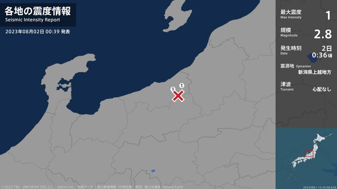 震度1 新潟県上越地方 00:36ごろ