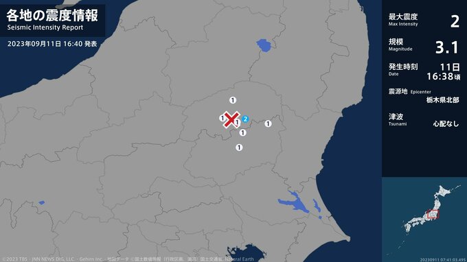 震度2 栃木県北部 16:38ごろ