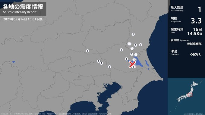 震度1 茨城県南部 14:58ごろ