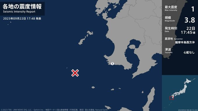 震度1 薩摩半島西方沖 17:45ごろ
