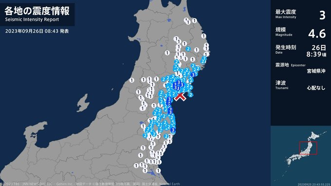 震度3 宮城県沖 08:39ごろ