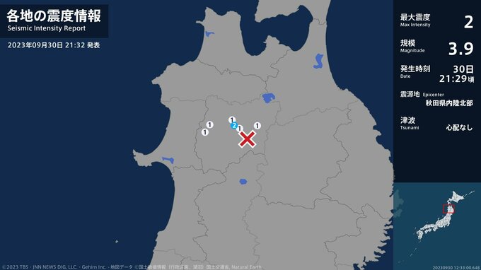 震度2 秋田県内陸北部 21:30ごろ