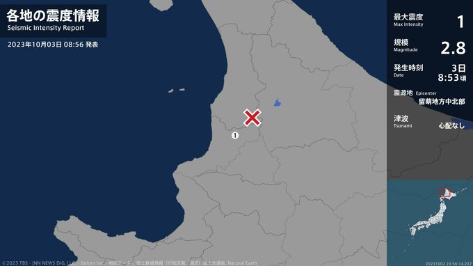 震度1 留萌地方中北部 08:53ごろ