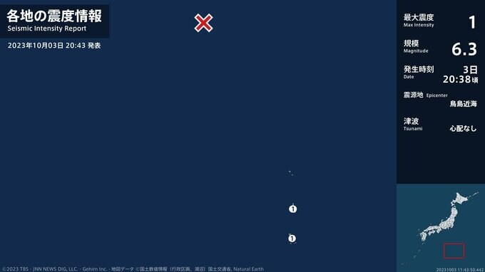 震度1 鳥島近海 20:38ごろ