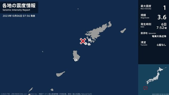 震度1 奄美大島近海 07:53ごろ